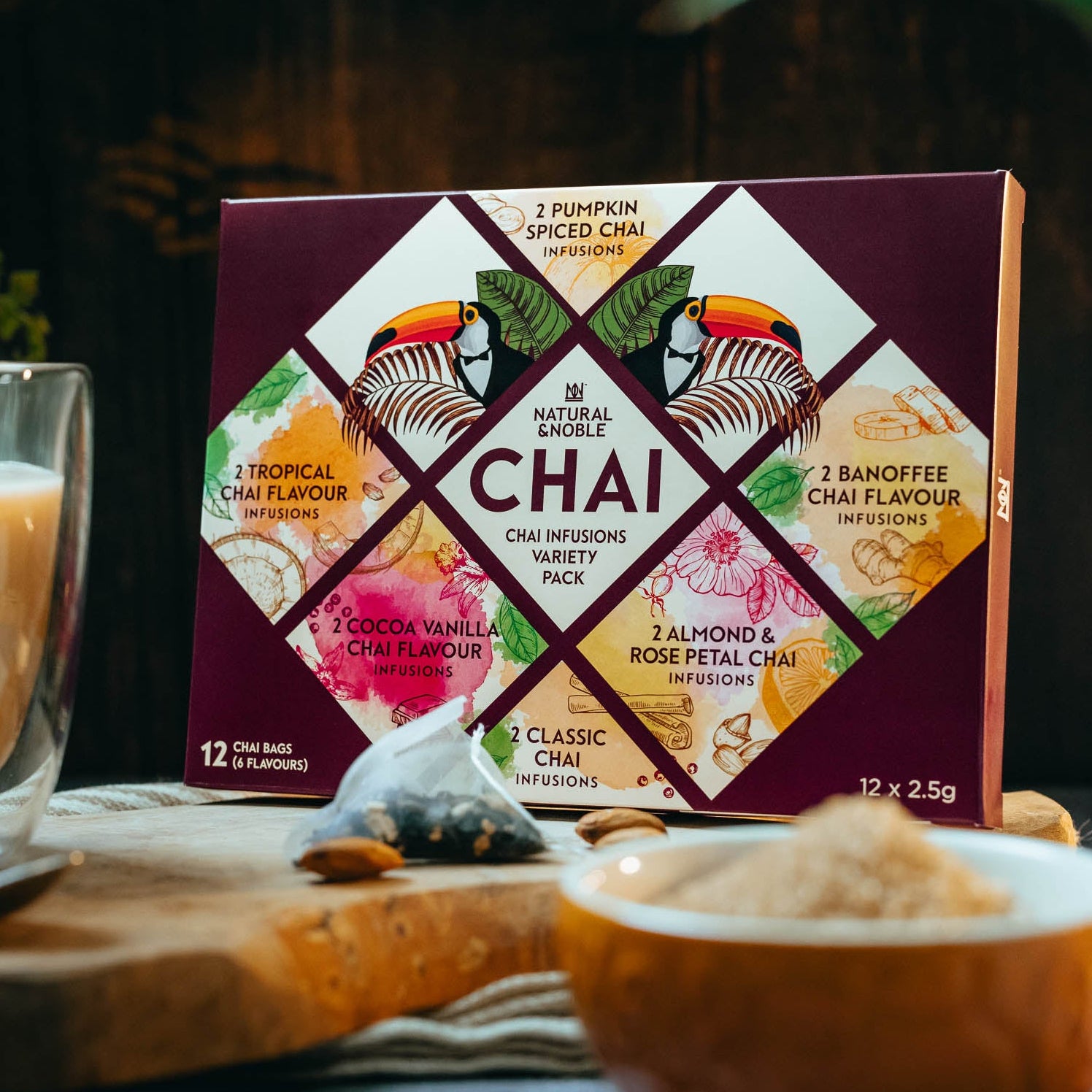 Tropical Chai - Black Tea (60%), Spices (27%) (Cinnamon, Ginger, Cardamom, Chilli), Desiccated Coconut (10%), Freeze-dried Mango (3%), Natural Flavouring.